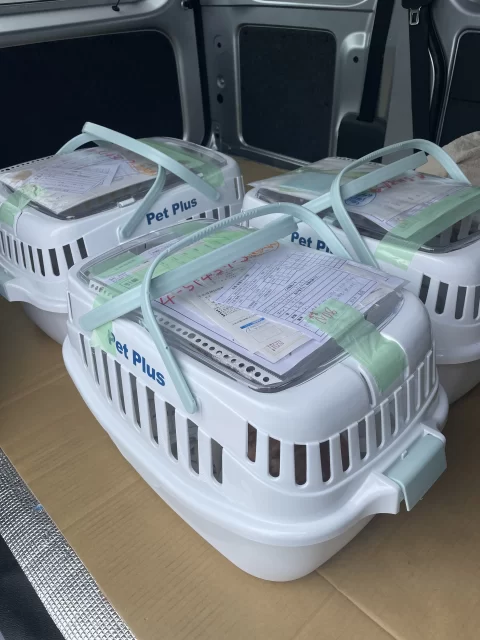 いい天気です かわいいワンちゃん達を軽貨物車で沖縄県那覇空港まで配送します 少し気温も高くなっております、温度管理に気おつけながら届けたいと思います 生体配送も沖縄HIKO軽急便にお任せください。